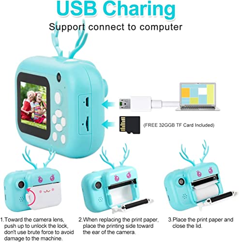 1000mAh RECHARGEABLE CAMERA & 32G TF CARD: Rechargeable camera for kids, equipped with the built-in 1000mAh rechargeable lithium battery and it can take photos or video for 3 hours. USB cable connect to computer to download pictures and videos. It also comes with a 32G TF card allows to store thousands of photos. No need to worry about running out of storage anymore