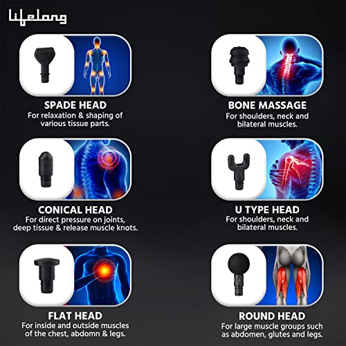 Round Head for large muscle groups such as abdomen, glutes and legs, Flat Head for inside and outside muscles of the abdomen, chest and legs, Conical Head for direct pressure on joints, deep tissue, trigger points and release muscles knots, U Type Head for shoulders, neck and bilateral muscles, Spade Head for relaxation and shaping of various tissue parts, cellulite and fat storage using percussion massage therapy, Bone Massage Head for joint muscles.