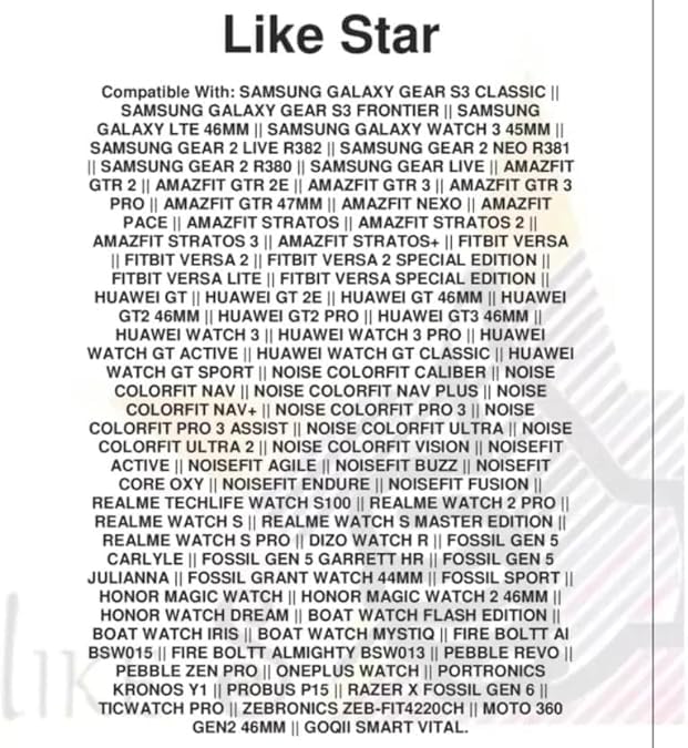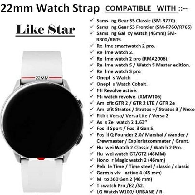 LIKE STAR 22 MM STRAP HIGH QUALITYT Compatible WITH NOISE :- ColorFit Pulse Buzz ColorFit Grande ColorFit Icon Plus ColorFit Ultra/Ultra 2, Ultra Buzz , Pulse 2 Max , Pulse Grand , Icon 2 Vista, Ultra2 Buzz , Icon 2 Evolve3 , Evolve , Halo, Mighty, Curve, Crew , Force , Force plus , Icon 3, Ultra 3 , Endure Colorfit Pro 4 / 4 Max/4 Alfta/ 4 GPS NoiseFit Twist , Caliber2, Caliber2 Buzz , Caliber ColorFit Pro 4 /Alpha/ GPS ColorFit Nav/Nav+ ColorFit Vision ColorFit Caliber ColorFit Pulse Grand ColorFit Ultra Buzz Colorfit Pro 3/ 3 Alfa/ 3 Assist COLORFIT Core/ Core 2/ Core 2 Buzz Active/ Victor/ Agilie/ Agilie 2 Buzz Fusion/ Vision/ Vision 2/ Vision 2 Buzz Pulse 2 Max/ Pulse Buzz REAL ME :- watch 2/2 pro watch S/S master edition / S pro WATCH 3/3PRO WATCH TECHLIFE R100 BOAT:- Ultima PRIMIA BLAZE IRIS FLASH Mi Xiaomi:- WATCH SPORT REVOLVE REVOLVE ACTIVE ZEBRONICS ZEB FIT ME ZEBFIT 4220CH Ppebble Pebble Time/ Time Steel DIZO:- Watch 2 Sport Amazfit :- GTR 3 / GTR 3 Pro / GTR 2 / GTR 2e / GTR 2 Lite / GTR (47 mm) / STRATOS FIRE BOLTT :- Talk/ Talk 2/ Talk Pro Invicible Almighty/ Ai 360 Pro Mercury Ninja Call 2/ Ninja Bell Neptune Hurracane Hulk Phoenix Beam Tornado Wonder HUAWEI: – HUAWEI WATCH GT CROSSBEATS :- Crossbeats orbit Crossbeats ace Crossbeats ignite S3 SAMSUNG:- WATCH 3 45 MM GEAR S3 FRONTIER GEAR S3 CLASSIC