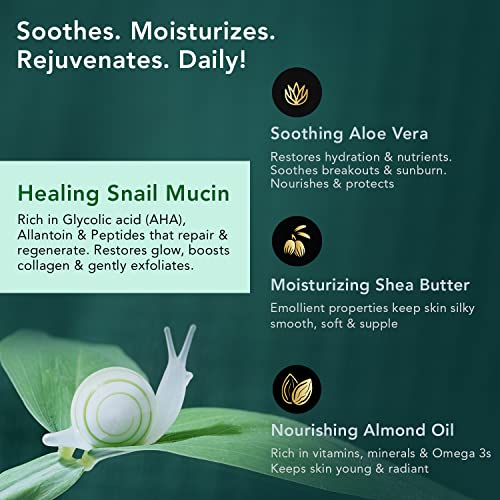 RESTORES GLOW: The mild exfoliating & powerful healing action of Snail Mucin along with deep hydration & nourishment of Aloe Vera, Shea Butter & Almond Oil, bring out your skin’s natural glow.
