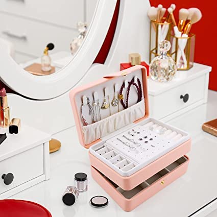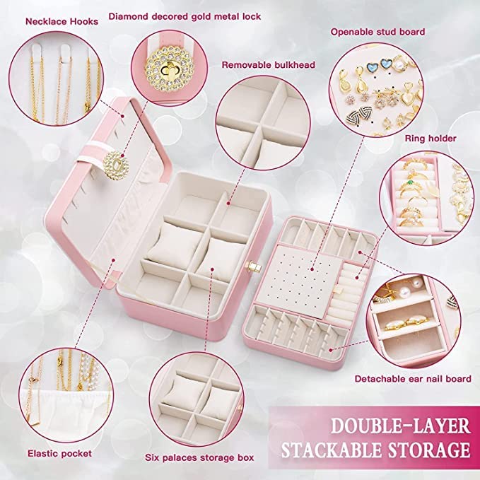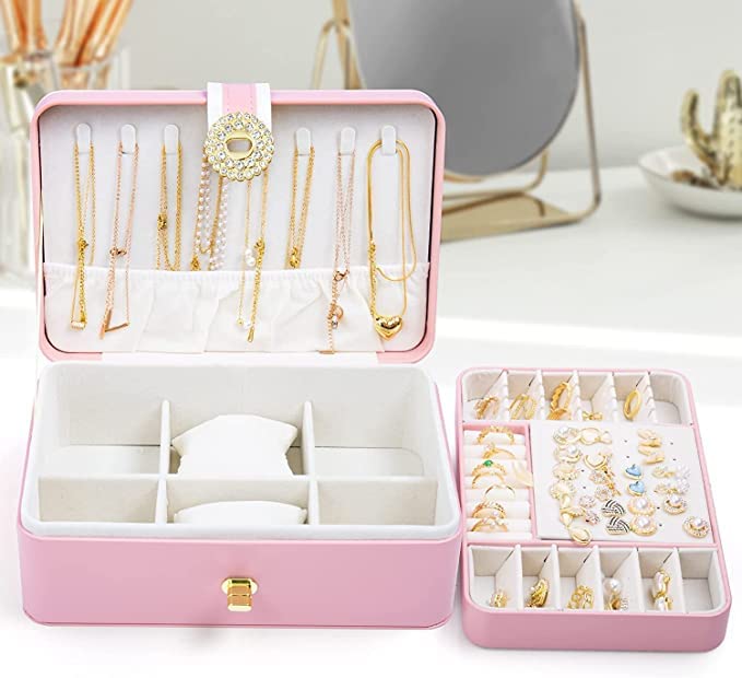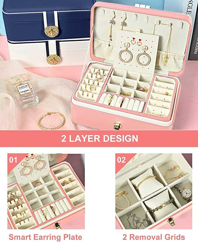 Jewelry Box Organizer, Double Layer Large Travel Jewelry Case for Earrings, Necklaces, Bracelets Storage, PU Leather and Soft Velvet Lined Jewelry Box