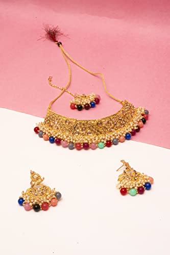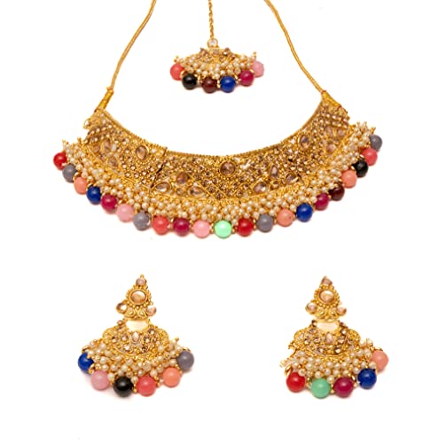 MARVELOUS ARTS – Gold Plated Pearl Choker Necklace with Earrings and Mang Tika, Jewellery Set Wedding Collection for Women