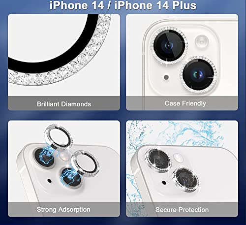 MAYA BALLE® Diamond Camera Lens Protector Compatible for iPhone 14/iPhone 14 Plus, [Anti-Scratch] Premium Tempered Glass Film Aluminum Alloy Lens Ring Cover – Silver Diamond
