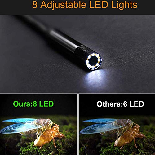 Unlike other soft cable, this flexible semi-rigid tube can be bent into any shape which will be convenient for entering into any zones to check for you.Internal iron wire supports the flexibility of the line.8 LED lights brightness is adjustable and lighting lamps are added, it greatly helps to improve image brightness and clarity even in dark or low-light condition.