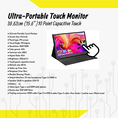 Miracle Digital 15.6” (39.624 Cm) Portable Ultra Touch Monitor Hi-Def 1920 x 1080 Pixels (2K Full HD) Eye Care IPS Monitor 2-Way Powered 60W USB- C with Smart Metal Stand with Leather Case Cover