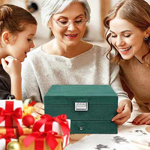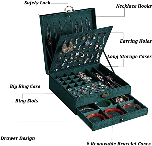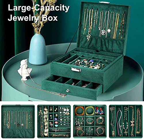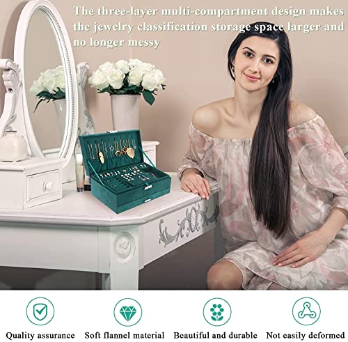 Mixen Easy-To-Use Jewelry Storage Box New 3layers Green Flannel Stud Jewelry Organizer Large Ring Necklace Makeup Holder Cases Velvet Jewelry Box with Lock Women
