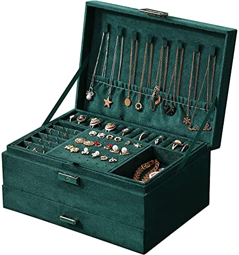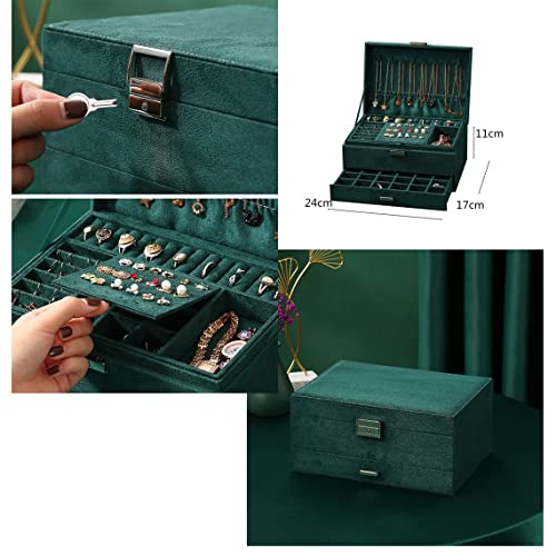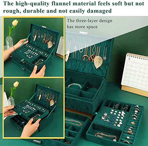 MORPICH® Women Jewelry Organizer Box, 3-Layer Velvet Jewelry Boxes Display Storage Case with Lock for Rings, Necklace, Earrings, Watches, Double Stackable Layer & Necklace Hangers Compartment (Green)