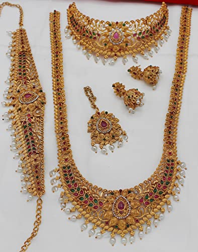 Nagneshi Art- Necklace Set for Women,Matte Finish Bridal Jewellery Set, Wedding Collection Necklace Earring, for Women-2 Neckless, 1 Pair Earring, 1 Maang Tikka, 1 Kamarband