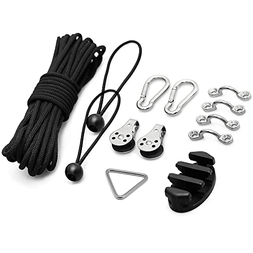 Kayak Anchor Trolley Kit :1 pcs Paracord,1 pcs Rope Cleat,1 pcs Anchor Ring,2 pcs Pulley,2 pcs Carabiner,2pcs Elastic Ring,4 pcs Pad Eyes,10 pcs Rivets,10 pcs Bolts,10 pcs Screws are included in the package