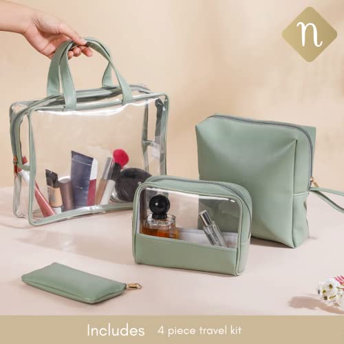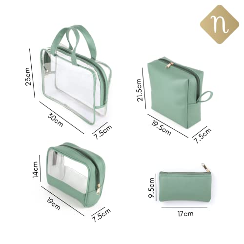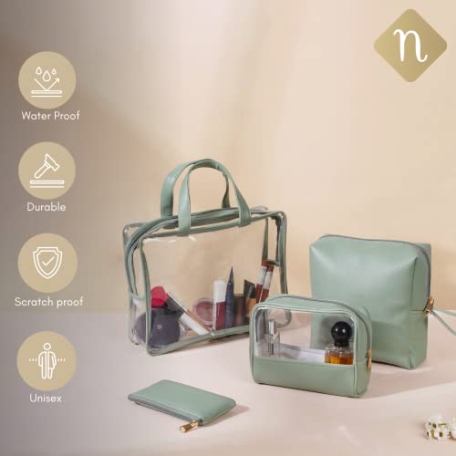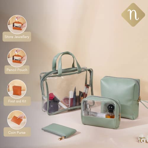 Nestasia Travel Pouch, Organizer, Toiletry Kit | Green Set of 4 Zipped Pouches of Different Sizes | Ideal for Travel Essentials | Vegan Leather Waterproof Travel Kit for Men & Women
