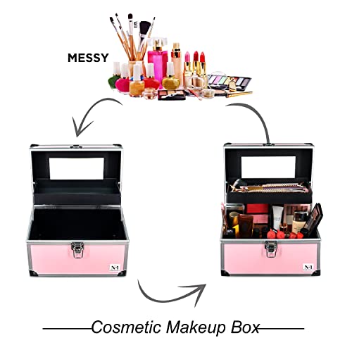 Material: Aluminum Cardboard Plastic- Lightweight, waterproof, durable, easy to clean makeup case, Extra-large cosmetic bag, elegant and stylish; Double-layer deign, Zip closure and 1 MlRROR for easily makeup.