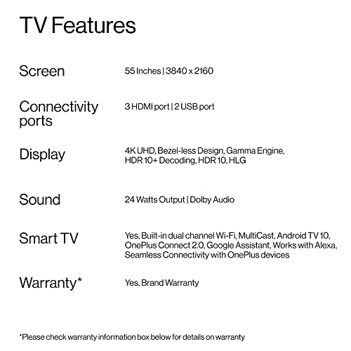 Smart TV features: Android TV | OnePlus Connect Ecosystem| Google Assistant | Chromecast, Miracast, DLNA | Auto Low Latency Mode | Supported Apps : Netflix, Youtube, Prime Video, Hotstar, SonyLiv, Hungama, JioCinema, Zee5, Eros Now, Oxygen Play