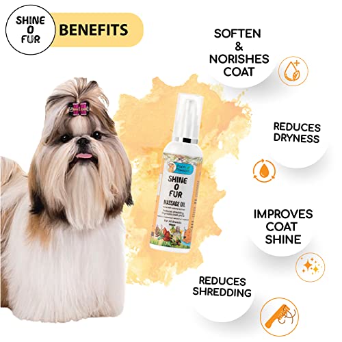 SHINE O FUR MASSAGE OIL FOR DOGS – Especially formulated to nourish and moisturize your dog’s coat/fur and improve its thickness and shine. With a blend of 100% natural ingredients, it’s also great for aromatherapy. With the goodness of Rosemary Oil, Cedarwood Oil, Almond Oil, and Jojoba Oil, this massage oil is a completely safe and effective remedy against skin issues. It deeply nourishes, moisturizes and keeps your dog’s fur healthy, thick, and shiny!