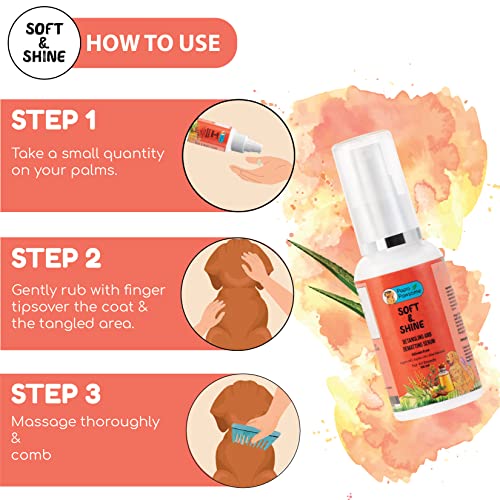 SOFT & SHINE DETANGLING & DEMATTING HAIR SERUM FOR DOGS – Especially formulated to detangle knots, fight matting, prevent hair breakage and hair loss, soften the hair and make it silky-smooth and shiny. With the goodness of Argan Oil, Jojoba Oil, Aloe Vera Extracts, and Wheatgerm Oil this hair/fur serum for dogs is completely safe and effective. It helps in detangling knots, dematting hair, softening coarse coat/fur and gives it a healhty, shiny and silky-smooth texture!