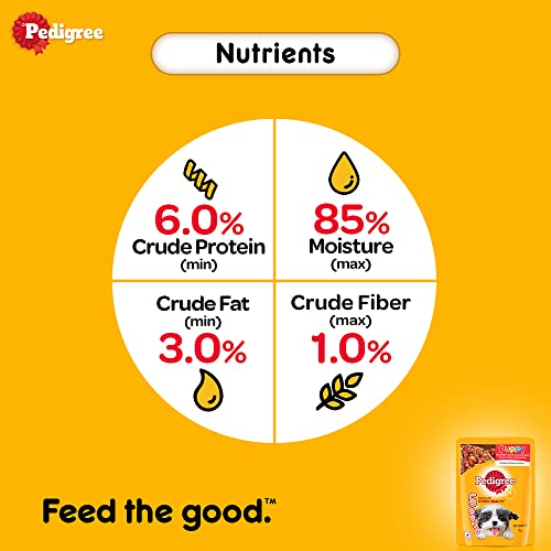 Pedigree gravy, made with quality ingredients, contains min. 6% Crude Protein in addition to min. 3% Crude fat, max. 1% Crude fiber & max. 85% moisture.