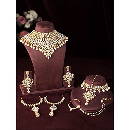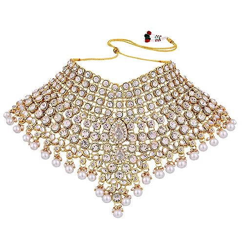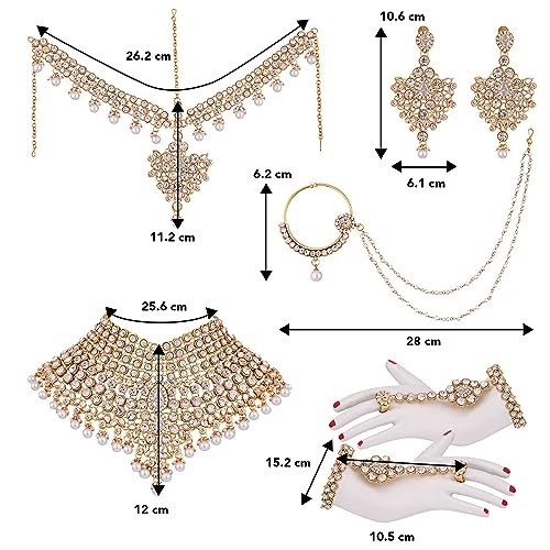Peora 18K Gold Plated Kundan Studded Jodha Akbar Bridal Choker Necklace Earrings Maangtikka Nathiya Haathpanja Traditional Jewellery Set for Women & Girls