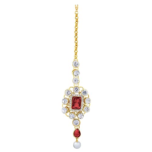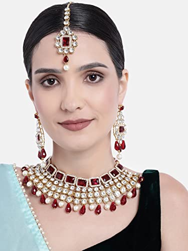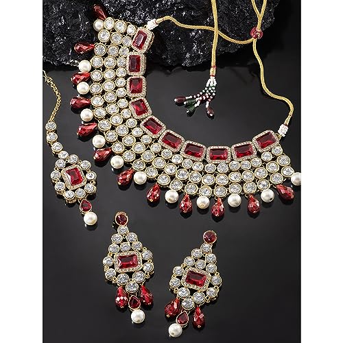 Peora Crystal Choker Necklace with Maang Tikka Earrings Indian Traditional Bridal Wedding Jewellery Set for Women