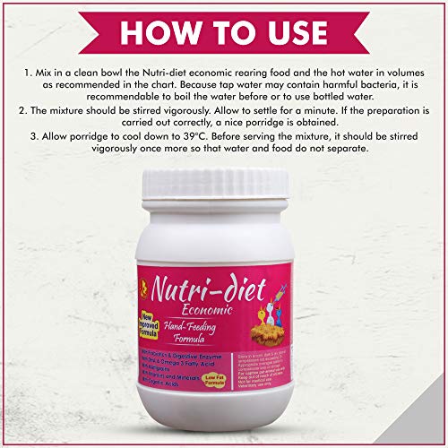 Nutri-diet economic hand-rearing food is prepared by adding warm water. The food-water ration changes with the age of the baby-bird and must be carefully adapted.