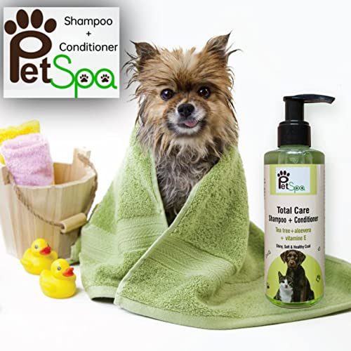 PET SPA TOTAL CARE dog and cat shampoo with aloe vera, vitamin E, and tea tree oil is a specially formulated pet shampoo designed to cleanse, soothe, and nourish the skin and coat of dogs and cats. Aloe vera is a natural moisturizer that helps soothe and hydrate dry, itchy skin. It also has anti-inflammatory properties that can help reduce redness and irritation. Vitamin E is an antioxidant that can help protect the skin from damage caused by free radicals. It also has moisturizing properties that can help keep the coat soft and shiny. Tea tree oil is a natural antiseptic and antifungal agent that can help treat skin conditions such as hot spots, ringworm, and yeast infections. It also has a refreshing scent that can help eliminate odors. In addition to these key ingredients, a dog and cat shampoo with aloe vera, vitamin E, and tea tree oil may also contain other beneficial ingredients such as oatmeal, chamomile, and coconut oil to provide additional moisture and nourishment to the skin and coat. The conditioner with the same ingredients helps to keep the coat smooth and silky, detangle knots and mats, and provides extra moisture to the skin and coat. The conditioner also helps to make brushing and grooming easier, and can help reduce shedding by strengthening the hair follicles. Overall, a dog and cat shampoo and conditioner with aloe vera, vitamin E, and tea tree oil can be a great choice for pets with sensitive skin or skin conditions, as it can help soothe and nourish the skin while keeping the coat looking and smelling great.