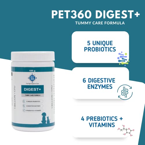 PET360 Digest+ | Tummy Care Formula with Probiotics, Prebiotics, Digestive Enzymes & Vitamins 100 gm Powder for Dogs, Puppies and Cats for Strong Digestion and Healthy Gut (100 GM)
