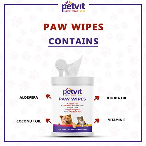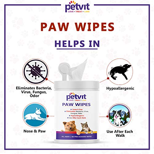 Petvit Nose and Paw Wipes Piece for Eliminates Bacteria, Virus, Fungus, Odor – Fragrance Less 50 Wipes |for All Age Group