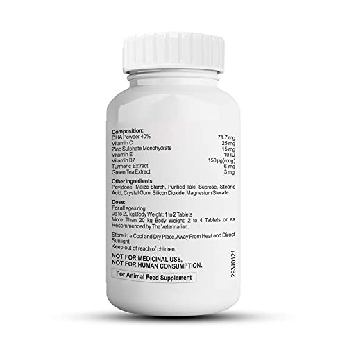 Petvit Skin coat supplement contains Vitamin C, Zinc Sulphate, Vitamin E, Vitamin B7, Turmeric, and Green Tea.