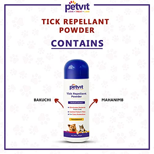 Petvit Tick Repellent Powder with Sandalwood, Bakuchi | for Ticks and Fleas, Itching, Fungal Infection| Paraben Free & pH-Balance -for All Breed Dog & Cat – 100gm