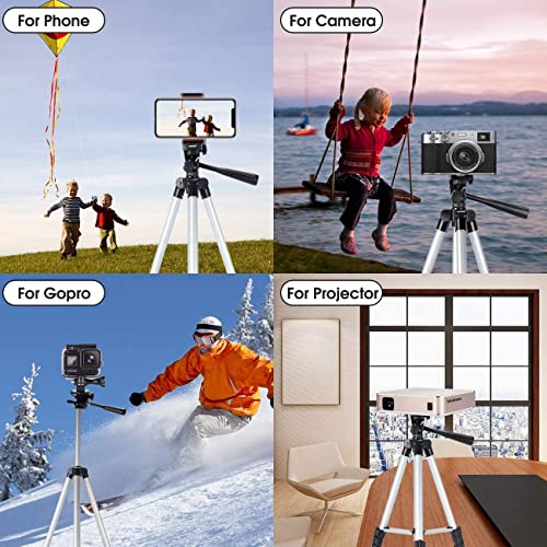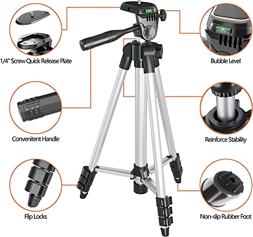PKST Camera Tripod Aluminum Professional Stand Holder, Whether you are a Novice or Professional photographer, you will need a steady and robust tripod for many of those wonderful photos This Traveler Tripod with pan head design is the best choice for outdoor photograph activities. With built-in bubble level making your tripod perfectly leveled. With non-slip rubber feet, it is ensuring a single adjustment of each leg, giving a more convenient leg handling. It has 4 section legs and it’s very light and convenient. It is designed for part-time photography lovers. Help them to take a high-quality scene or group photos without motion and long-time human hand-holding. Professional DSLR Camera Stand,. The pan head handle easily controls the camera. Remote blue tooth connection with phone. The product can be adjusted to a maximum height of 146cm, giving you more options when shooting. With 3 feet made of lightweight aluminum alloy and sturdy, large diameter, you can place on even rugged, uneven terrain. product is equipped with remote and microphone to make it a complete package for making videos for you tube and other videos of still photos. With a compact size of only 13” when retracted the tripod makes the perfect companion for every special moment. You can carry it with ease to any event. Easily fits in any travel bag. Light a construction makes it conveniently weighted. Easy Setup Easy use clasps make extending and retracting the tripod legs a breeze. Simply open clasp to unlocked position and extend the section you wish to make longer. The legs can be extended individually or together for the best result in stability and camera angle Fast Neck Extension Extending the neck in the Tripod is as easy as twisting the locking knob counter clock wise and pulling up on the neck until desired length is achieved. To lock simply tighten the knob by twisting clock wise Smartphone Mount With the Universal Smartphone Mount it is a breeze to set up any type of smartphone from 2.2″.