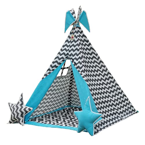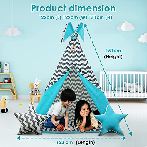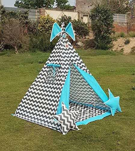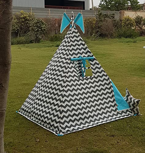 Play Tents Teepee Play Tent with Cushions Mat Flags&Windows,Assemble&Portable,Foldable Design&Lightweight,Play Tents for Kids Age 10 to 12 Yrs (Color-Blue/Grey,Fabric- Cotton), 1 Tent House Theme