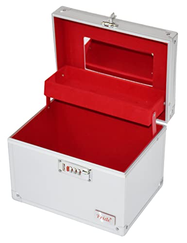 Pride Large Aluminium Framed Jewellery Vanity Case With A Faux Leather Effect Covering And four Extendable Compartments. Perfect For Storing Make Up, Jewellery, Cosmetics And Toiletries With Its Robust Design And Easy Grip Carry Handle. Faux maroon Suede Interior For A Luxury Finish With A Number Lock To Keep Your Items Safe And Secure. A Stunning Vanity Case Crafted Beautifully For Salon Professionals And Perfect For Home Use. This Gorgeous Cosmetics/Jewellery Case Is Made From Aluminium Which Guarantees Durability. The Stylish Handle Also Ensures Easy Transportation With Its Lightweight Nature. The Case Comes Complete With a number Lock. Not Only Complementing The Silver Hinges But Provides Ultimate Security, For Example When Taking It Away For The Weekend; You Know Your Cosmetics Will Be Safe And Secure. A Must Have For Sorting Make Up, Beauty Products, Jewellery And More! Length = 23 cm, height = 18 cm, weidth= 18 cm