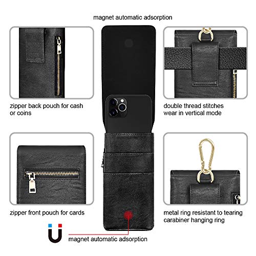 FUNCTION: The Holster Vegan Leather Mobile Pouch on the back has a belt loop that fit all type of belts and is convenient, versatile & portable. It also has tough carabiner belt clip for an easy detachable clip feature as well as a soft inner lining to protect your device from scratches.