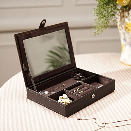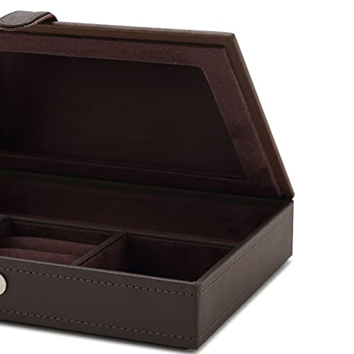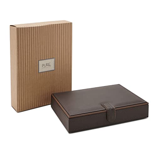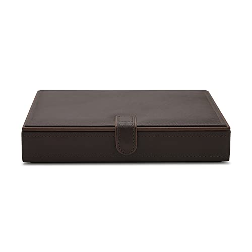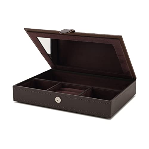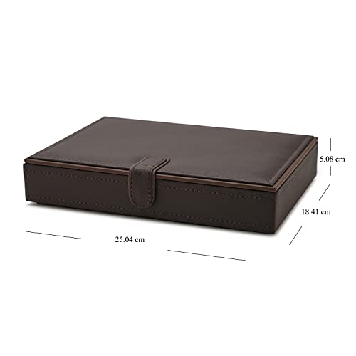Tidy up your vanity with this dark brown jewellery box. Made of faux leather, the box is hand-stitched to perfection. It comes with compartments and cushioning inside to keep your jewels safe.