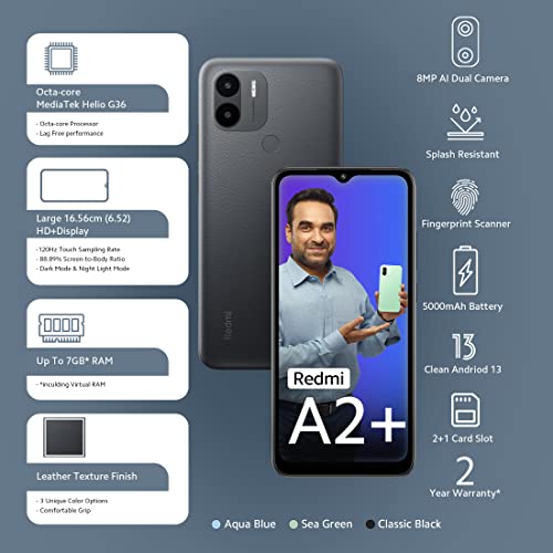 Redmi A2+ (Classic Black, 4GB RAM, 64GB Storage) | Upto 7GB RAM | Octa Core Processor | Fingerprint Scanner | 2 Years Warranty [Limited time Offer]
