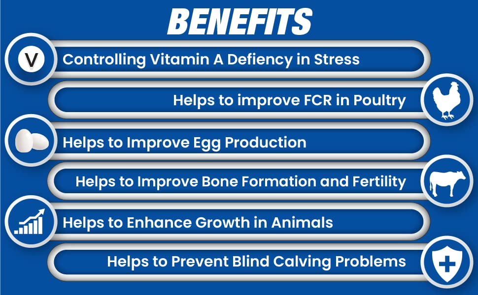 Specific Uses of Product : Helps to reduce Vitamin A deficiency in Animals, Helps to remove stress, Helps to improves FCR, Helps to improves Egg Production in Poultry Birds, Useful in Bone Formation, Helps in the overall Growth