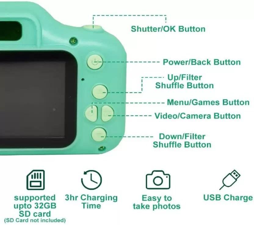 children’s camera is a digital product specially designed for children, plastic protective cover and high-definition pictures and videos, a variety of different types of puzzle games. Keep children away from mobile phones, love nature and enjoy nature. Children’s camera provides a new way for children to play, it will be their best friend. Cultivate children’s photography hobby and give full play to children’s imagination. Kid’s camera provides children with an easy way to learn photography, allowing children to record the beauty of life like a photographer. Product size: 83 *61 *48 mm Weight: 0.65 KG Screen size: 2.0 inches Screen type: IPS full screen display Photo resolution: 3 megapixels Charging voltage: 5V – 1A Charging time: 2 hours Battery capacity: 1000 mAh (working 4-6 hours) Battery type: polymer lithium battery Take photo, Setting.Our kids recording camera max support 32GB micro SD card (Card is NOT included). It includes 5 puzzle games which also make this camera more interesting for your kid. Toddler always have the dream. This Kids Camera is a digital product specially designed for children with a unique appearance.2.0 Inches LCD Screen, soft silicon cover and high-definition picture and video. Perfect birthday, Christmas, holiday gifts for boys and girls aged 3~8. Kids can enjoying the fun of taking pictures and this camera can exert children’s imagination well, is a good toy for children go outside traveling or daily record.