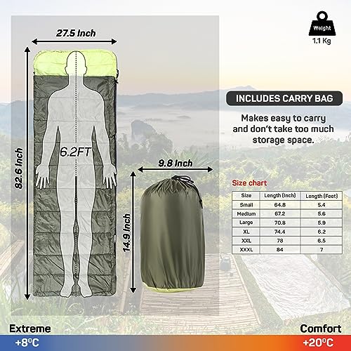 SUITABLE WITH APPLICABLE SEASON : With the Sleeping bag Adults Size of 6.2 feet length, We ensure that it fits everyone. Everyone can use in spring, autumn and Mild winter but not for extreme cold winters