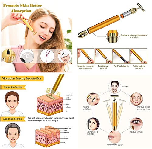 The t-Shaped head adds mild vibration to push and pat the face skin and therapeutic point. Relax facial muscles.Waterproof Facial Roller: Can use in the bathroom. Reshape your face contour to reveal your youthful energy.Gold Energy Beauty Bar Electric Vibration Facial Massage Roller, T-Shaped Anti Wrinkle Massage,