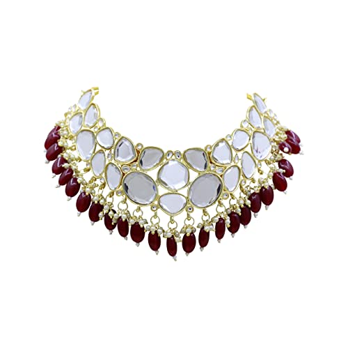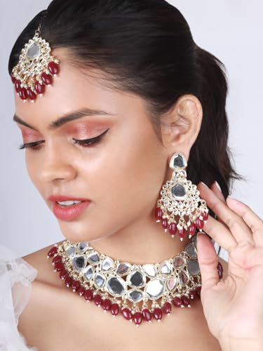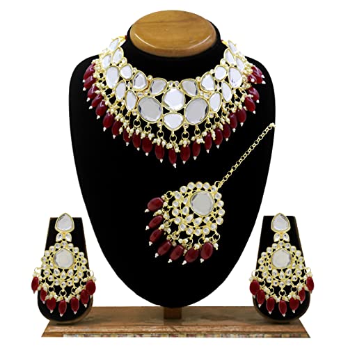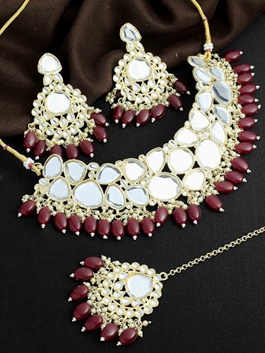 SAIYONI Traditional Wedding Collection Glamorous Look Gold Plated Kundan Stone & Beads Choker Necklace Earring with Maangtikka jewellery Set