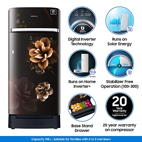Samsung 198 L 5 Star Inverter Direct-Cool Single Door Refrigerator (RR21T2H2WCB/HL, Camellia Black, Base Stand with Drawer, 2022 Model)