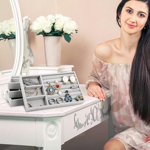 SPACE-SAVING DESIGN: The 4pcs jewelry organizers are stackable, allowing you to maximize your storage space. They can be easily placed on top of each other to create a compact and organized display. Alternatively, you can use them as dividers for your jewelry drawer to keep your items well-organized and tidy. This space-saving feature is especially useful for those with limited storage space.