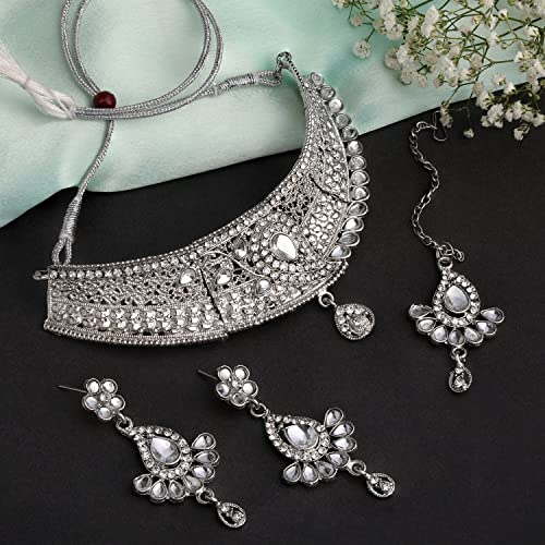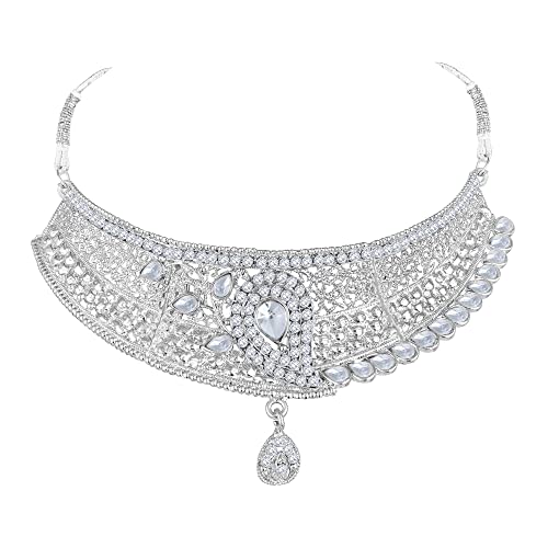 Shining Diva Fashion Diamonds Studded Silver Plated Latest Stylish Traditional Choker Necklace Jewellery Set for Women