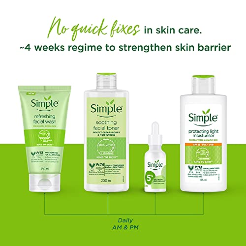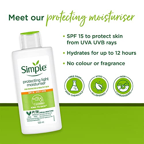 At Simple, we’re all about saying no to skin irritants. What we leave out of our products is just as important as what we put in! In fact, we only include ingredients that downright love your skin and respect its natural balance. Because all skin can be sensitive at times; pollution, stress, irritants, changing weather, lack of sleep and city living, there’s a million reasons why your skin can feel a little sensitive and need the extra care and kindness. Replenish and protect your skin the Simple way with our Kind to Skin Protecting Light Moisturiser SPF15! This skincare essential is an ideal addition to your daily SPF routine, hydrating skin for up to 12 hours whilst helping to protect from UVA and UVB rays. Our Protecting Light Moisturiser is not only convenient, combining moisturising and protecting ingredients to help care for your complexion, but like all our products it is suitable for sensitive skin; it contains no artificial colours or perfumes and no harsh chemicals that can upset your skin. Using an SPF moisturiser is important all year round, not just in the summer months; protecting your skin is a key step on the road to a happy, healthy looking complexion! Featuring our special blend of Simple moisturising goodness containing Pro-Vitamin B5, Vitamin E, Glycerin, Allantoin, Bisabol and SPF15, this hardworking beauty staple is ideal to use after your favourite Simple cleanser to keep skin moisturised, nourished and protected – we’re all about feel good skin, and being kind to our complexion is a great way to give our beauty routine a boost!
