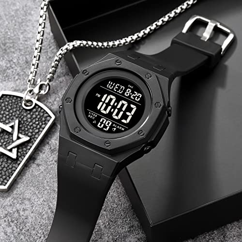 Highlights: *Big face watch for men, LED backlight for easy reading of time and calendar *Japanese original digital movement, provides precise and accurate timekeeping, more stable work and less noise *High hardness resin glass protects you from daily minor injuries * 5 ATM waterproof, suitable for daily use and different types of outdoor and indoor sports and activities, such as swimming, bathing, showering * Stopwatch timer, support 1/100 second timer * 2 years life Japanese original battery, keep time for a long time Accurate Features : *Electronic LED Backlit Dial *Chronograph *Calendar with Day and Date (Week) *Alarm *Scratch Resistant Mirror Surface *5 ATM Water Resistant? 164 Ft / 50 M Water Resistance