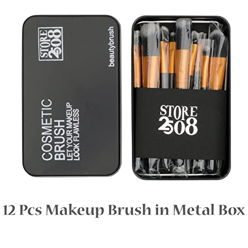 Store2508 Makeup Brush Set with 12 Brushes and Metal Storage Box 2 Pcs Makeup Blender Silicone Makeup Brush Cleaner