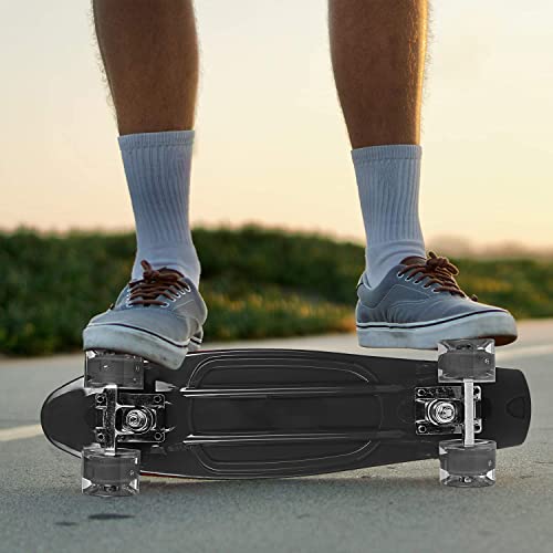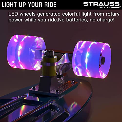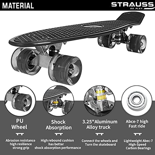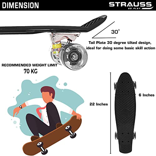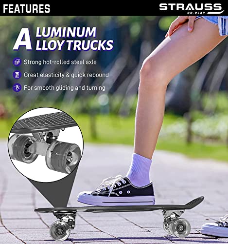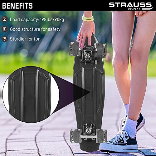 STRAUSS Cruiser PW Skateboard| Penny Skateboard | Casterboard | Hoverboard | Anti-Skid Board with ABEC-7 High Precision Bearings | PU Wheel with LED Light |Ideal for All Skill Level | 22 X 6 Inch,(Black)