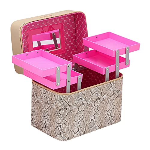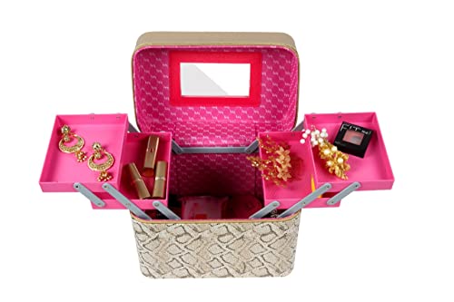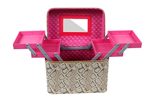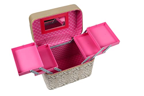 STRIPES Gold Color Snake Skin Print Makeup Organizer Bag with Mirror for Travel, Makeup Box, Vanity Box Cosmetic Case with 5 Compartments 2 Layer Tray (Brown)