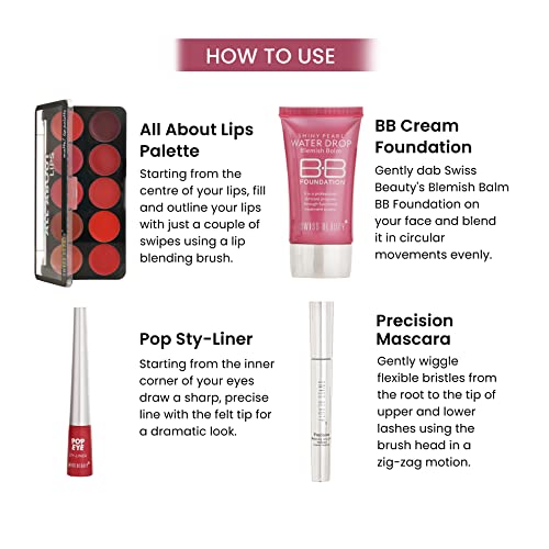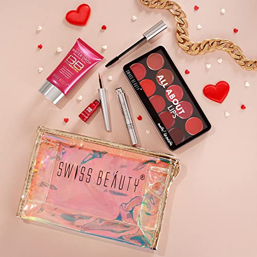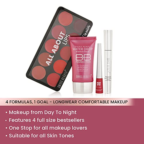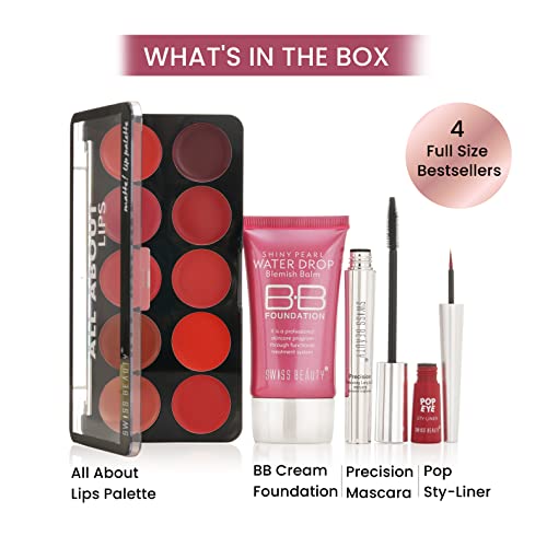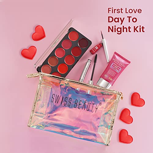 Swiss Beauty First Love Day-Night Makeup Kit with pouch | BB Foundation with SPF15, Multi-Purpose Lip Palette with 10 shades, Smudge-proof & Water-Resistant Eyeliner and Mascara | Long-Lasting | Makeup Kit for All Occasions