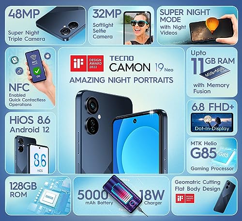 TECNO Camon 19 Neo (Eco Black, 6GB RAM, 128GB Storage)|48MP Super Night Rear Camera|32MP Selfie Camera|Upto 11GB Expandable RAM|6.8″ FHD+LTPS Display|Helio G85 Processor