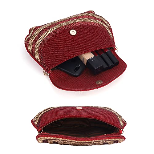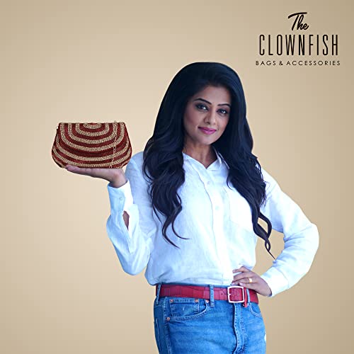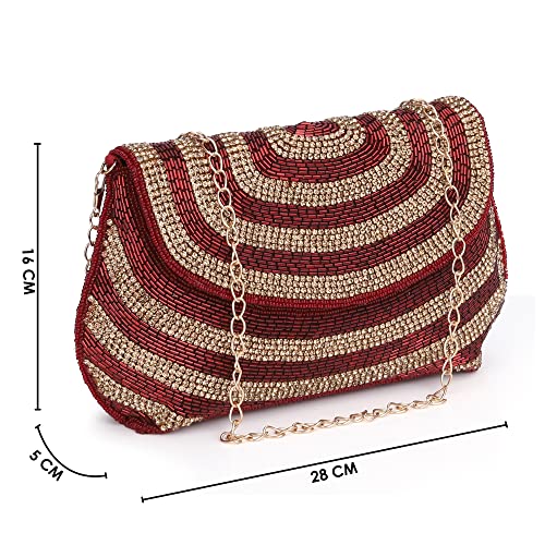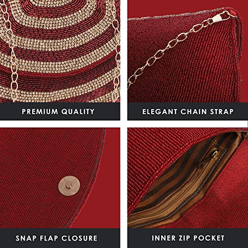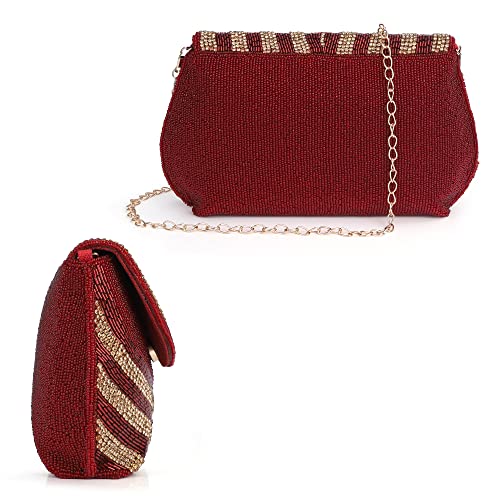 THE CLOWNFISH Shyna Collection Womens Party Clutch Ladies Wallet Evening Bag Fashionable Round Corners Beads Work Floral Design with Chain Strap (Maroon)