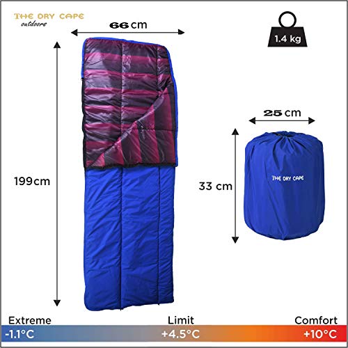 Stay warm, even when the temperature dips to 30° F (-1.11 degree C), in your The Dry Cape Turbine Cool Weather Sleeping Bag with nylon cover and soft Synthetic fiber blend liner sleeping bag. size: 199 x 66 cm. package size (l x w): 33 x 25 x 23 cm and is machine washable.